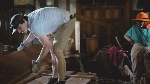 Nick and his brother, Logan, started to sort through the shorter lumber, setting up a yes, no, and maybe pile. Ann jinxed us — not long after warning us about snakes and spiders, Nick turned over a board and found a Wolf Spider the size of her drunk dog.